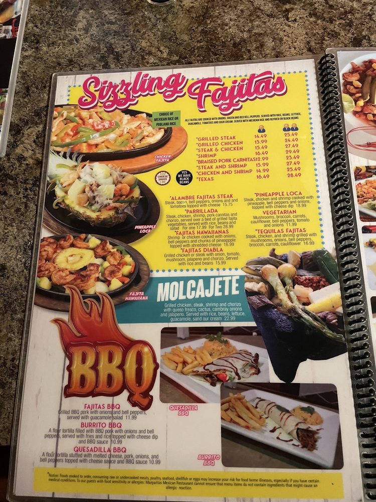 Steak, chicken an shrimp fajitas with chunks of pineapple topped with shredded cheese. (Does not include, tomatoes, onions, mushrooms and peppers) served with beans, Mexican rice, tortillas, tomato, lettuce and sour cream.